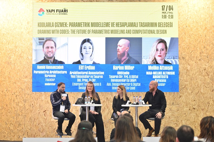Fuarın ikinci günü 17 Nisan’da ise “Mimarlığın Yeni Matriksi” teması ile tasarımın evrimi, teknoloji ile ilgili yenilikler ele alındı. Geleneksel tasarımın anlayışının yerini veri ve algoritmaların alması, yapay zeka destekli tasarımın yaratıcılığı nasıl dönüştürdüğü, parametrik modellemenin sunduğu esneklik ve verimlilik, 3D baskının inşa süreçlerine etkisi, sektördeki ileri düzey çözümler ve mimarlığın yeni kodları tartışıldı.