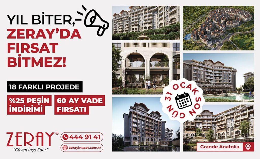 Zeray İnşaat, Aralık ayında Geleneksel Yıl Sonu Kampanyası ile konut sahibi olmak isteyenlere ve yatırımcılara büyük bir fırsat sundu. Zeray’ın Geleneksel Yıl Sonu Kampanyası, Kocaeli ve Ankara’da yer alan 18 projede, peşin alımlara %25 indirim veya 60 ay vade fırsatı ile büyük ilgi gördü. Zeray, gelen yoğun talep üzerine kampanyaya Ocak ayında da devam ediyor.